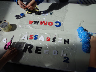 The materials used, included, material and cardboard letters, matchsticks, wool, buttons and plenty of sticky tape.